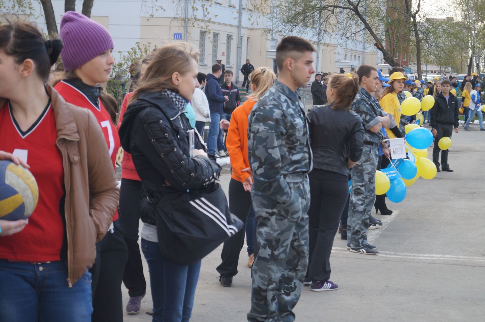 На площади перед университетом делегацию встречали студенты, преподаватели и гости Сибстрина. В ожидании приезда кортежа собравшиеся увидели фристайл от футболистов, волейболистов, баскетболистов, свое шоу показала группа велосипедистов с флагами пяти цветов Универсиады. Выступила группа «Аэробика», Bizz Up Crew, прозвучал «Студенческий рэп» о Сибстрине, а в завершение творческие коллективы вуза показали дефиле в костюмах с танцевальными элементами. Особый шарм представлению придала огромная ростовая кукла Бурого медведя. В ожидании встречи с символом Универсиады – Снежным Барсом – медведь приплясывал на сцене и обнимался с артистами.