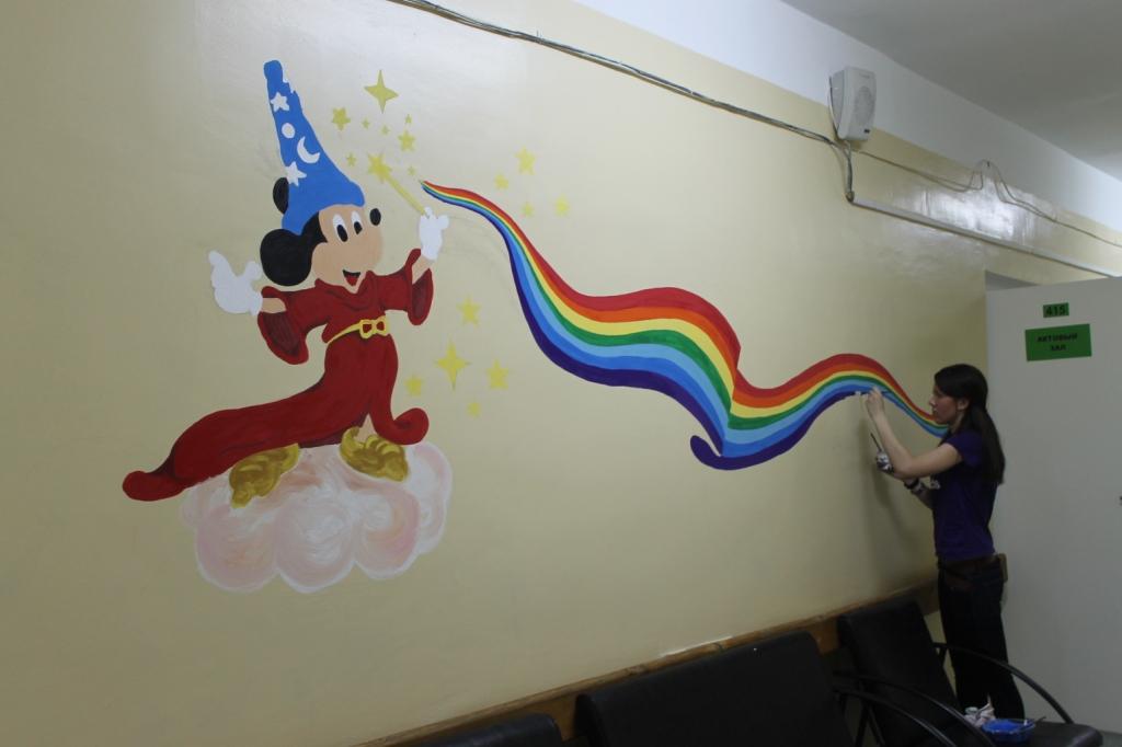 В детском отделении Новосибирского областного противотуберкулезного диспансера студенты 411 группы: Нижегородцева Юля, Хлыбова Юля, Коваль Соня, Атанова Рита, Пекшева Юля, Шостак Алена оформили коридор, который является приглашающим пространством к холлу.
