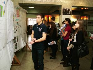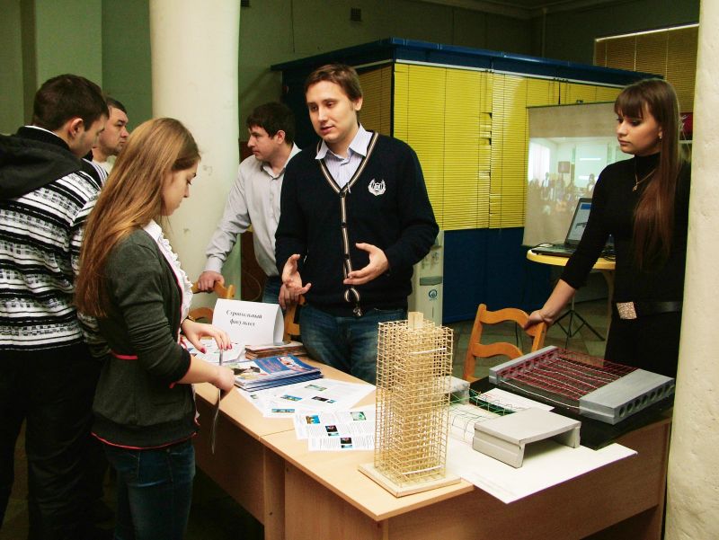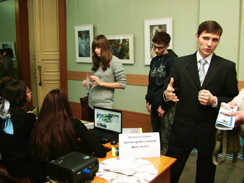 В течение всего дня в холле актового зала работали стенды факультетов, где школьники и их родители могли получить подробную информацию по поступлению в наш вуз и задать все интересующие вопросы. Факультеты представили очень интересную выставку – факультет инженерных и информационных технологий продемонстрировал опыты на определение химического состава строительных материалов, инженерно-экологический факультет представил богатую коллекцию виде-роликов и презентаций о жизни факультета, строительный факультет, архитектурно-градостроительный факультет, факультет экономики, менеджмента и гуманитарного образования представили школьникам хороший раздаточный материал, показали лучшие квалификационные работы, яркие презентации.