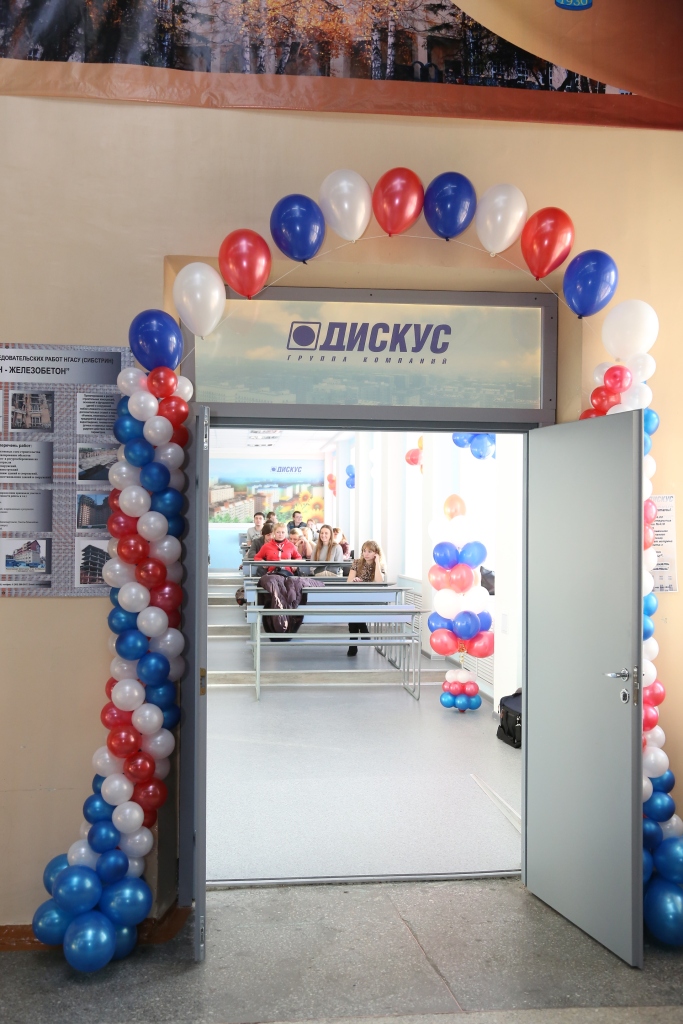 Группа компаний «ДИСКУС» во главе с генеральным директором А.Ю. Джулаем реализовала дизайн-проект аудитории. На открытии присутствовал генеральный директор А.Ю. Джулай, ректор НГАСУ (Сибстрин) Ю.Л. Сколубович, руководство вуза, сотрудники группы компаний «ДИСКУС».