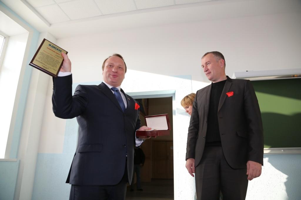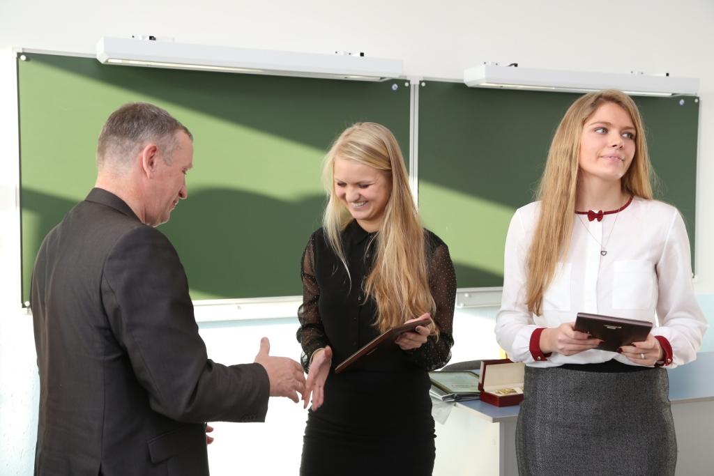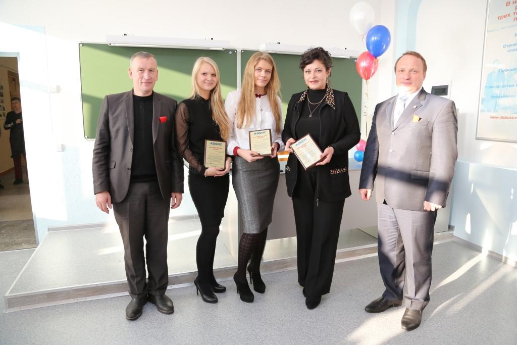 Алексей Юрьевич вручил памятные таблички ректору университета и авторам дизайн-проекта 419 аудитории: студенткам 412 группы Юлии Хлыбовой, Юлии Нижегородцевой и их руководителю, Евгении Владимировне Кетовой.