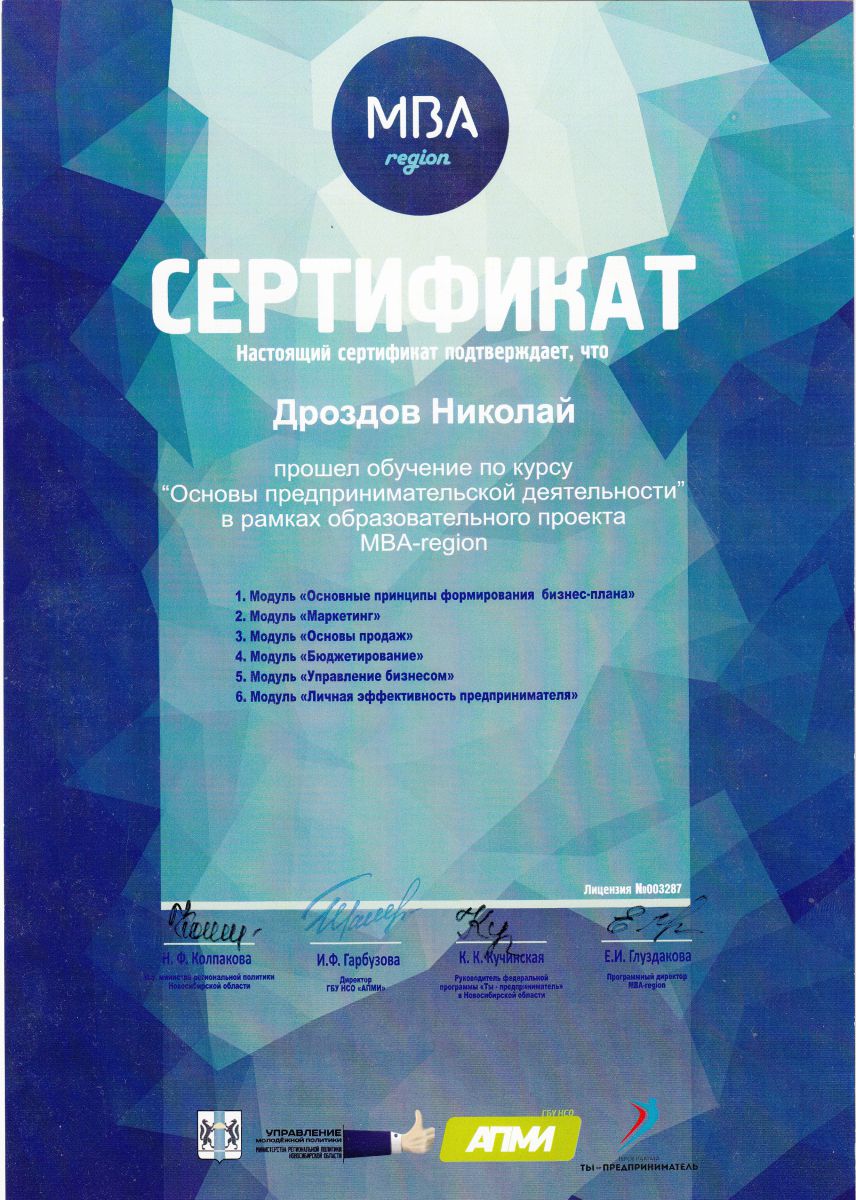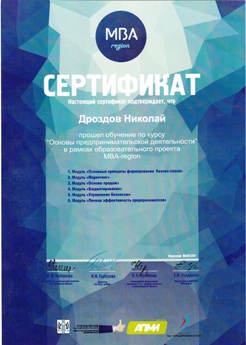 Участники проекта с 14 мая по 4 июля прошли очный курс по основам предпринимательской деятельности от ведущих бизнес-тренеров Новосибирска, в числе успешных выпускников программы MBA- Region оказались и представители нашего университета, а именно студент 5 курса факультета вечернего и заочного обучения Александр Крантов и начальник отдела маркетинга Дроздов Николай Михайлович.