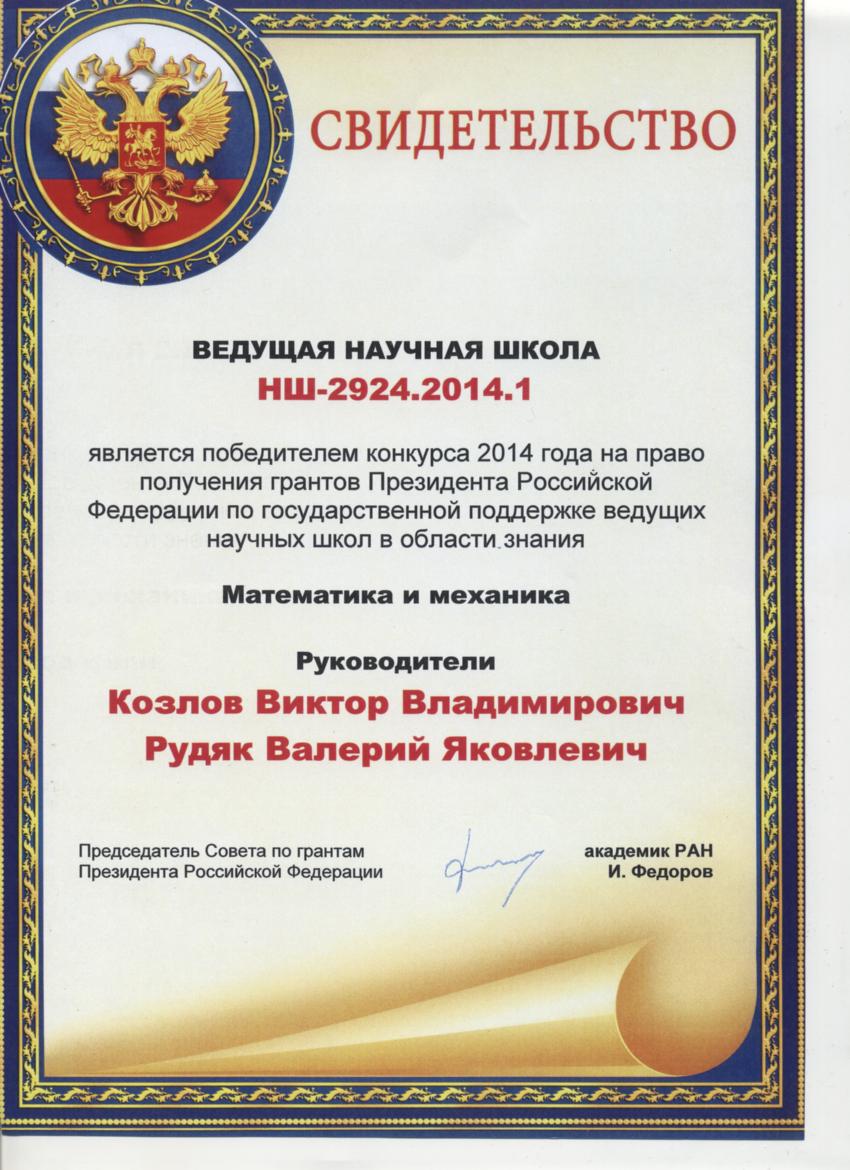 Министерство образования и науки Российской Федерации подвело итоги конкурса 2014 года на право получения грантов Президента РФ для государственной поддержки ведущих научных школ. По результатам рассмотрения заявок победителем в конкурсе на право получения грантов в области знания «математика и механика» стала научная школа НГАСУ (Сибстрин) под руководством заведующего кафедрой теоретической механики, профессора В.Я. Рудяка.