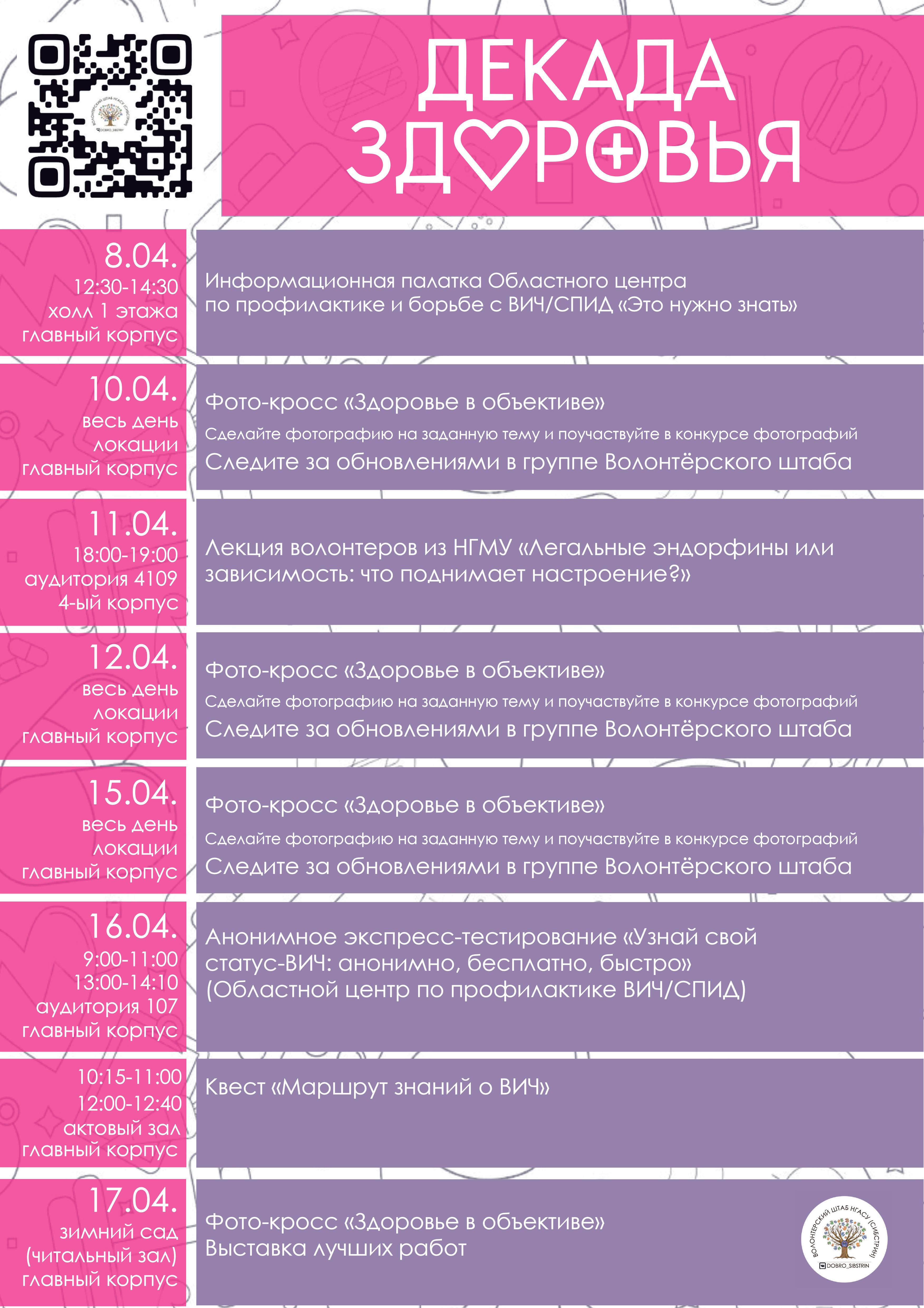 - 16 апреля, 9:00-11:10, 13:00-14:10. Анонимное экспресс-тестирование «Узнай свой статус-ВИЧ: анонимно, бесплатно, быстро» (Областной центр по профилактике ВИЧ/СПИД) – аудитория 107 главный корпус