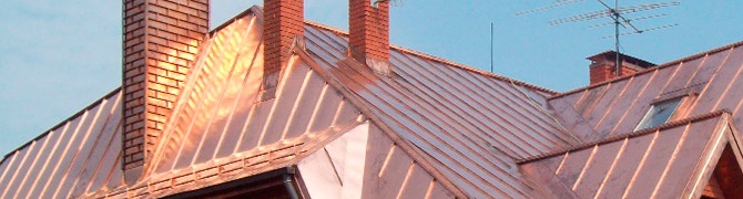 Из металла кровельное покрытие может быть в форме профилированного листа или черепицы. Иногда используется цельные листы железа, которые скрепляются между собой замками. Другой вид материала - кровля из меди в Москве и других городах этот материал доступен для продажи и активно используется. Данный вид материала обладает рядом преимуществ, которые позволяют рассматривать цены на фальцевую кровлю довольно выгодными. Рулонная кровельная медь устойчива к воздействию окружающей среды, имеет небольшой вес, эстетично выглядит и рассчитана на долгий срок эксплуатации. Следует заметить, что монтаж кровельной конструкции из меди должен осуществляться специалистами.