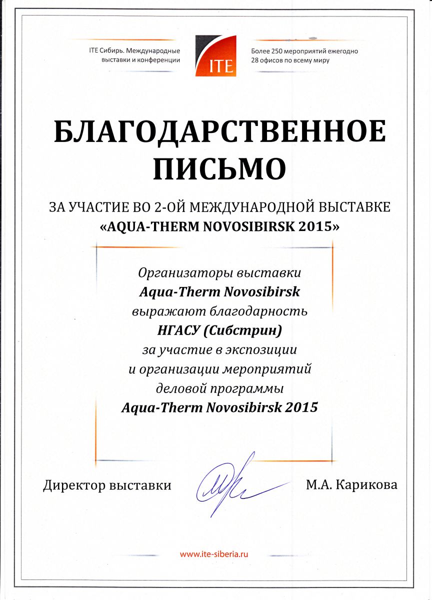 За время работы «Aqua-Therm Novosibirsk» стенд НГАСУ (Сибстрин) вызвал немалый интерес у специалистов и широкого круга посетителей. Выставка закончилась для университета большим количеством переговоров с представителями бизнеса по вопросам возможного сотрудничества в области повышения квалификации и переподготовки кадров, обеспечения экологической безопасности производства и других. По итогам работы университет отмечен Благодарственным письмом организаторов 2-й Международной выставки «Aqua-Therm Novosibirsk».