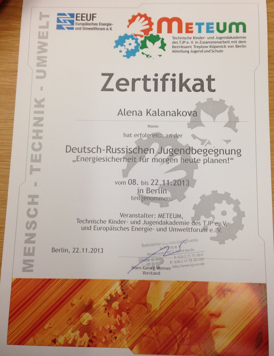 Международная молодежная экологическая встреча «Энергобезопасность на завтра планируем уже сегодня!» проходила в Берлине с 8 по 22 ноября 2013 года. Это уже четвертое мероприятие, организованное с начала действия проекта «Международный молодежный экологический обмен» (сентябрь 2012 г.), реализуемого при поддержке Правительства Новосибирской области, Новосибирской региональной комиссии подготовки управленческих кадров, а также ряда российских и немецких организаций.