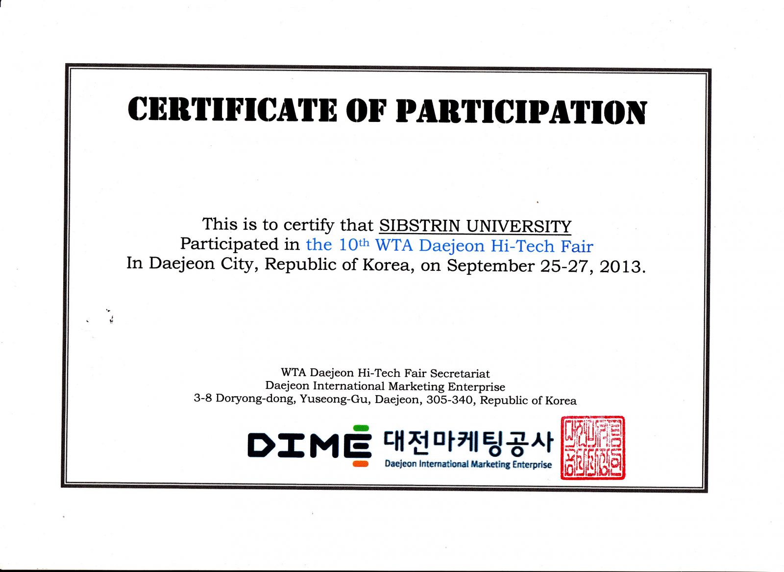 25-27 сентября 2013 года в г. Тэджон (Республика Корея) в Daejeon Convention Center, под эгидой Всемирной ассоциации технополисов, прошла 10-я международная высокотехнологичная выставка "WTA Daejeon Hi-tech Fair" на тему "Creative Industry and Entrepreneurship Ecosystem" (инновационное и экологическое предпринимательство).