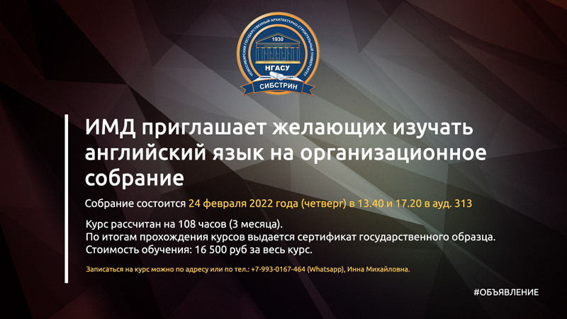 24 февраля 2022 года (четверг) в 13.40 и 17.20 в ауд. 313 главного корпуса состоится организационное собрание для желающих изучать английский язык.