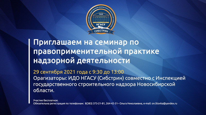 29 сентября 2021 года с 9 час. 30 мин. до 13 час. 00 мин. Институт дополнительного образования НГАСУ (Сибстрин) совместно с Инспекцией государственного строительного надзора Новосибирской области проведет мероприятие, где будут обсуждаться вопросы правоприменительной практики надзорной деятельности.