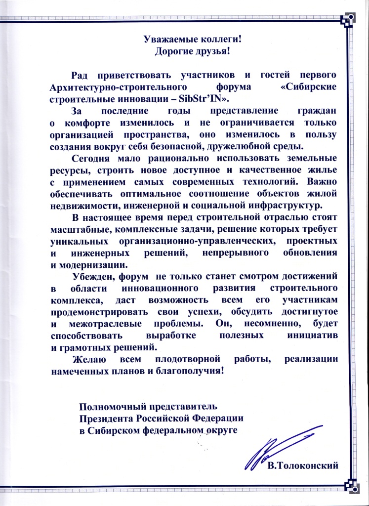 Приветствие участникам первого Архитектурно-строительного форума "Сибирские строительные инновации - SibstrIN", проведенного в рамках выставки "СТРОЙСИБ-2013" от Полномочного представителя Президента Российской Федерации в Сибирском федеральном округе В.А. Толоконского.