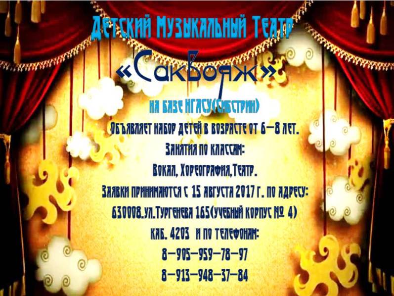 Начинается набор в Детский музыкальный театр "Саквояж" при ЦВВР университета. Занятия будут проходить по субботам по адресу ул.Тургенева, д.165 (уч.корпус№4).