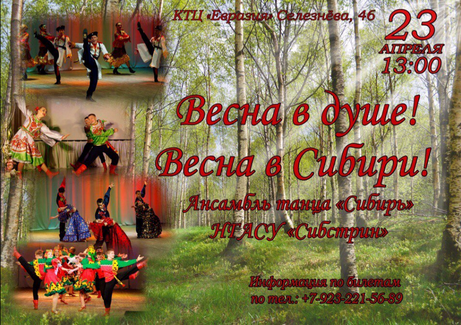 Приглашаем Вас на празднование 15-ти летнего юбилея ансамбля танца «Сибирь», которое пройдет 23 апреля в концертно-театральном центре «Евразия» (ул. Селезнева, 46). Начало в 13.00.