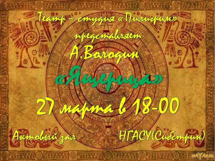 27 марта 2017 года в актовом зале НГАСУ (Сибстрин) состоится премьера спектакля театр-студии «Пилигрим» по пьесе замечательного драматурга Александра Володина «Ящерица». Начало в 18.00.