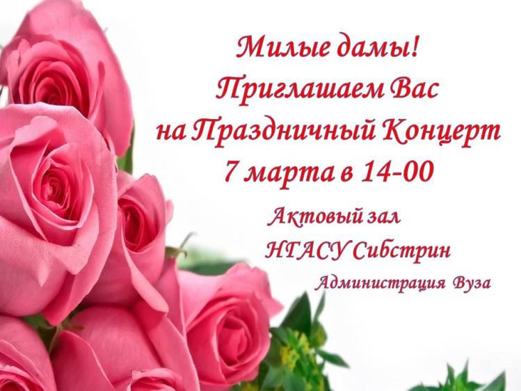 Приглашаем Вас на праздничный концерт, посвященный Международному женскому дню 8 Марта. Концерт пройдет 7 марта (вторник) в 14.00 в актовом зале вуза.
