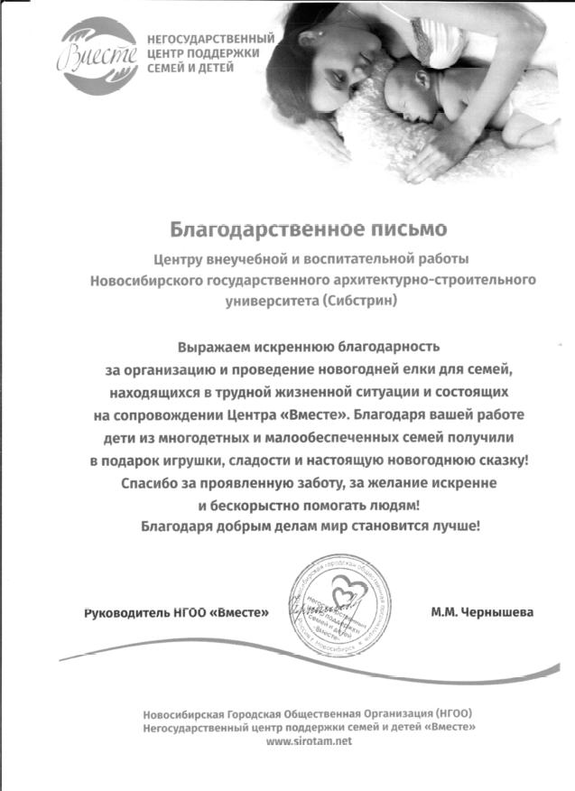 Также в адрес Центра по внеучебной и воспитательной работе НГАСУ (Сибстрин) пришло Благодарственное письмо от Негосударственного фонда поддержки семей и детей «Вместе» за «настоящую сказку», организованную для детей из многодетных и малообеспеченных семей.