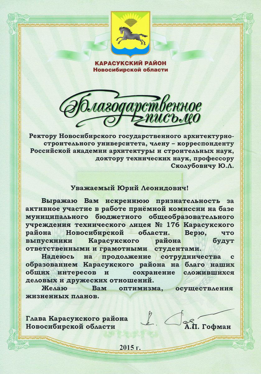 На имя ректора НГАСУ (Сибстрин) Ю.Л. Сколубовича пришло благодарственное письмо за подписью главы Карасукского района Новосибирской области А.П. Гофмана.