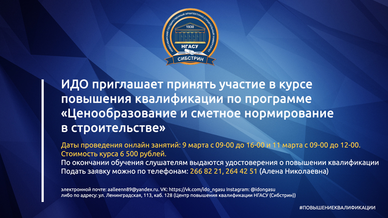 Институт дополнительного образования НГАСУ (Сибстрин) предлагает принять участие в дистанционном курсе повышения квалификации по программе «Ценообразование и сметное нормирование в строительстве».