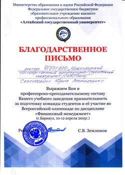 Ректор Алтайского государственного университета С.В. Землюков выразил особую благодарность ректору Новосибирского государственного архитектурно-строительного университета (Сибстрин) Ю.Л. Сколубовичу и всему профессорско-преподавательскому составу за подготовку команды студентов и ее участие во Всероссийской олимпиаде по дисциплине «Финансовый менеджмент».