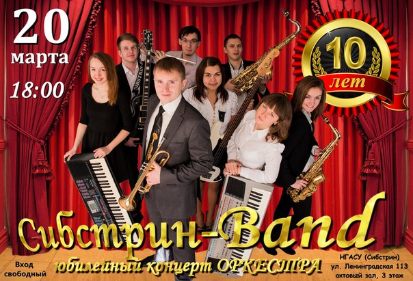 20 марта 2015 года состоится отчетный концерт, посвященный 10-летнему юбилею оркестра «Сибстрин-бэнд». В программе – лучшее из репертуара коллектива за 10 лет. Только живая музыка! Участвуют музыканты всех составов.
