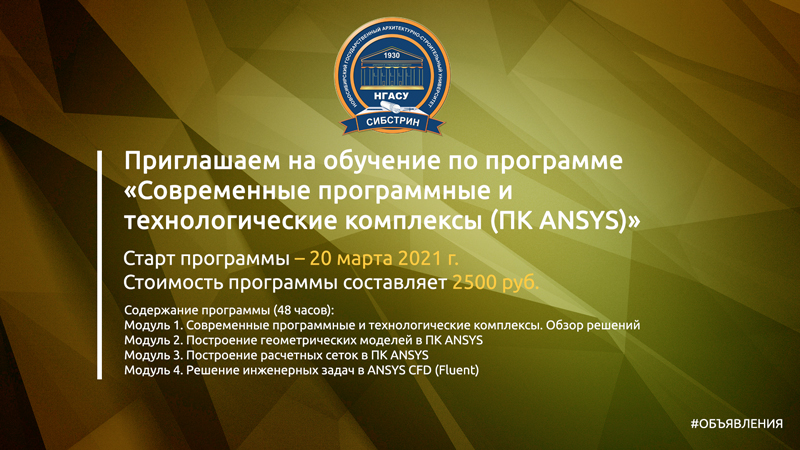 Институт дополнительного образования приглашаем студентов НГАСУ (Сибстрин) на обучение по программе «Современные программные и технологические комплексы (ПК ANSYS)». Новая программа предусматривает модульное освоение материала (очно-заочное обучение с применением дистанционных образовательных технологий) в течение одного месяца.