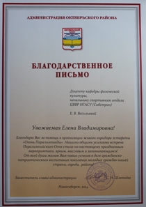 На имя начальника спортивного отдела ЦВВР НГАСУ (Сибстрин) Е.В. Васильевой пришло благодарственное письмо администрации Октябрьского района города Новосибирска за помощь в организации живого коридора эстафеты огня XI Паралимпийских зимних игр в Сочи. 27 февраля 2014 года студенты, преподаватели и сотрудники НГАСУ (Сибстрин), организованные ЦВВР, приняли активное участие в проведении новосибирского этапа эстафеты паралимпийского огня, состоявшегося в парке «Городское начало» и набережной реки Обь.