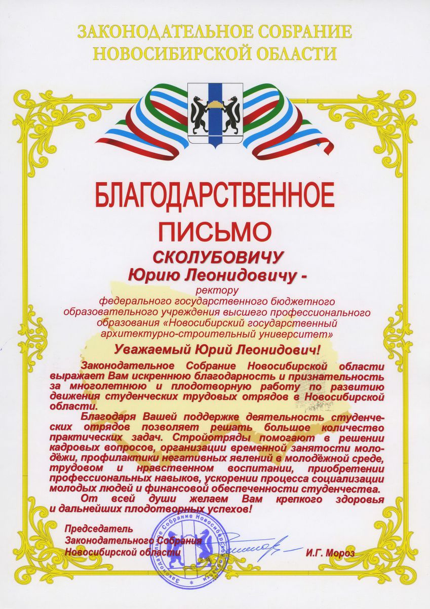Традиционно высокую оценку получила деятельность строительных отрядов НГАСУ (Сибстрин), а ректор Ю. Л. Сколубович был награжден Благодарственным письмом Законодательного собрания Новосибирской области за плодотворную работу по развитию движения студенческих отрядов.