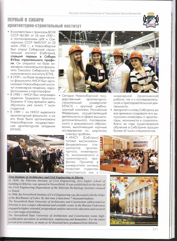 НГАСУ (Сибстрин) представлен в издании как первый в Сибири архитектурно-строительный институт: "В соответствии с приказом ВСНХ СССР №1381 от 18 мая 1930г. и постановлением ЦИК и Совнаркома СССР №40/237 от 23 июня 1930г., в Новосибирске был открыт Сибирский строительный институт (Сибстрин), ставший первым в Сибири вузом архитектурно-строительного профиля".