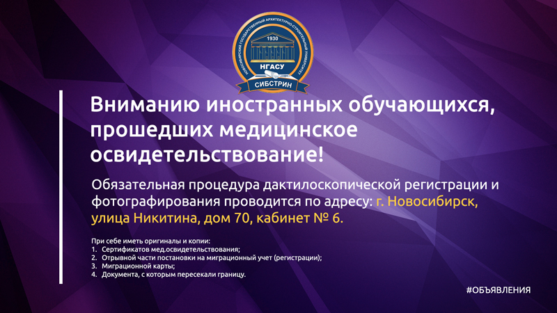 Обязательная процедура дактилоскопической регистрации и фотографирования проводится по адресу: г. Новосибирск, улица Никитина, дом 70, кабинет № 6.