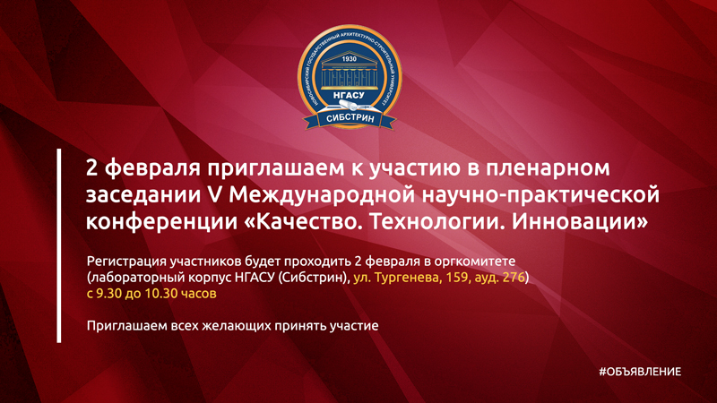 2 февраля 2022 года (среда) на базе Новосибирского государственного архитектурно-строительного университета (Сибстрин) состоится пленарное заседание V Международной научно-практической конференции «Качество. Технологии. Инновации».