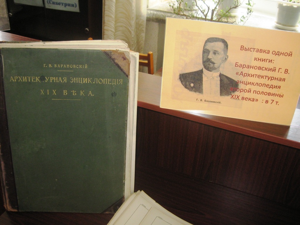 Выставка одной книги: Барановский Г. В., "Архитектурная энциклопедия второй половины XIX": в 7 т. Это оригинальное многотомное издание редакции журнала "Строитель", выпущенное типографией Санкт-Петербурга в 1902-1908 гг. и не имеющее аналогов ни в России, ни в мире. Автор энциклопедии - Барановский Гавриил Васильевич, архитектор и историк архитектуры. В издание включены лучшие на тот период времени образцы художественно-архитектурного творчества, представлены фотографии, графические таблицы с подробными изображениями фасадов зданий, их фрагментов, планы, различные проекции, перспективы, разрезы и пр., иллюстрирующие все богатство мировой архитектуры и зодчества.