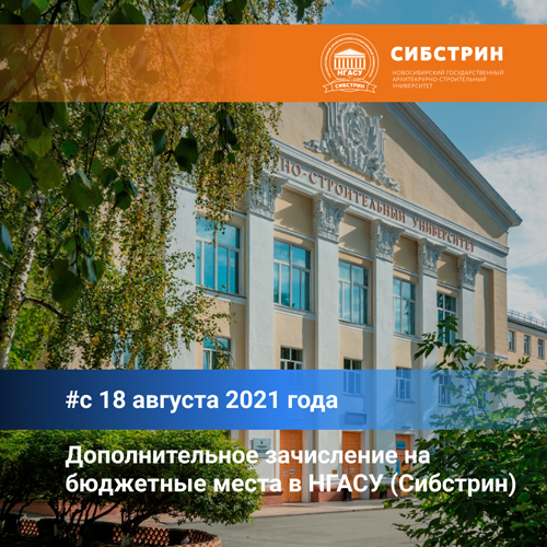 Не упусти шанс поступить на бюджет! В соответствии с Правилами приема 2021 года НГАСУ (Сибстрин) объявляет с 18 августа 2021 года дополнительное зачисление на бюджетные места по программам бакалавриата «Строительство» и «Природообустройство и водопользование» для абитуриентов, подавших документы на поступление в НГАСУ (Сибстрин).