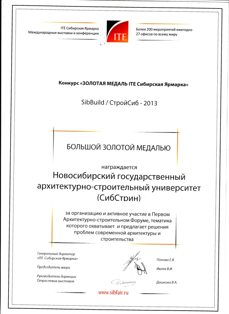 Поздравляем!!! По итогам международной выставки "СТРОЙСИБ-2013" НГАСУ(Сибстрин) награжден "Большой золотой медалью".