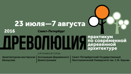 Практикум «ДРЕВОлюция» пройдет с 23 июля по 7 августа 2016 года в Санкт-Петербурге, на территории Лесотехнического университета. Приглашаем молодых архитекторов, плотников и всех, кому небезразлична современная деревянная архитектура, стать участниками практикума.