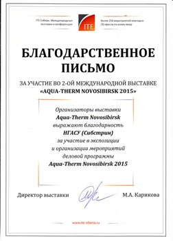 За время работы «Aqua-Therm Novosibirsk» стенд НГАСУ (Сибстрин) вызвал немалый интерес у специалистов и широкого круга посетителей. Выставка закончилась для университета большим количеством переговоров с представителями бизнеса по вопросам возможного сотрудничества в области повышения квалификации и переподготовки кадров, обеспечения экологической безопасности производства и других. По итогам работы университет отмечен Благодарственным письмом организаторов 2-й Международной выставки «Aqua-Therm Novosibirsk».