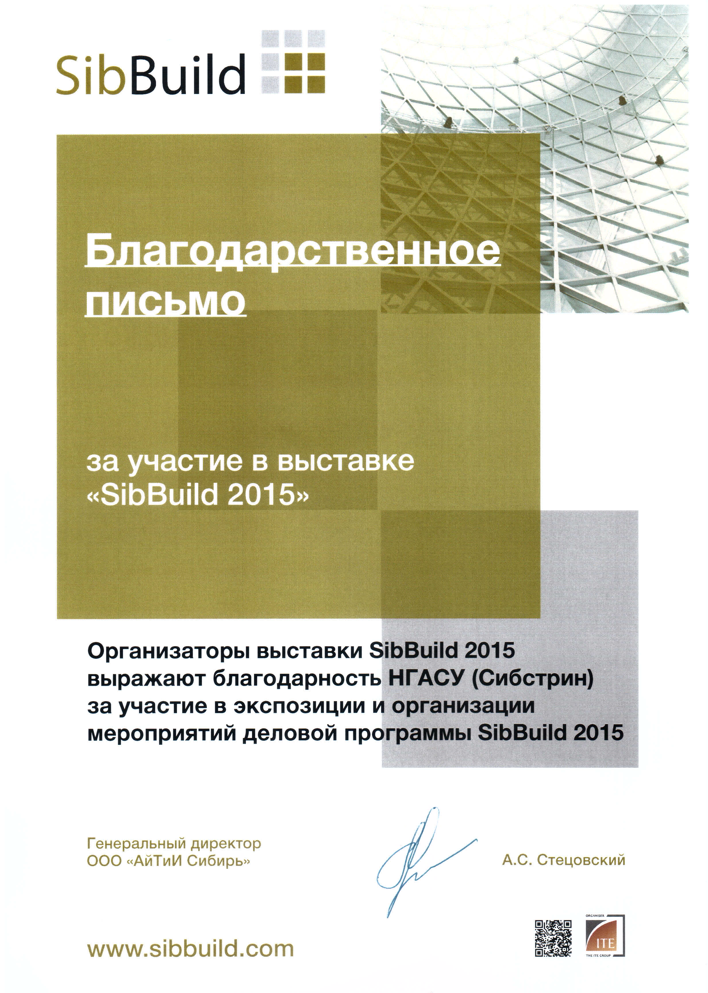 Как участник выставки университет отмечен Благодарственным письмом организаторов Международной строительной и интерьерной выставки «СтройСиб-2015» за участие в экспозиции и организации мероприятий деловой программы.