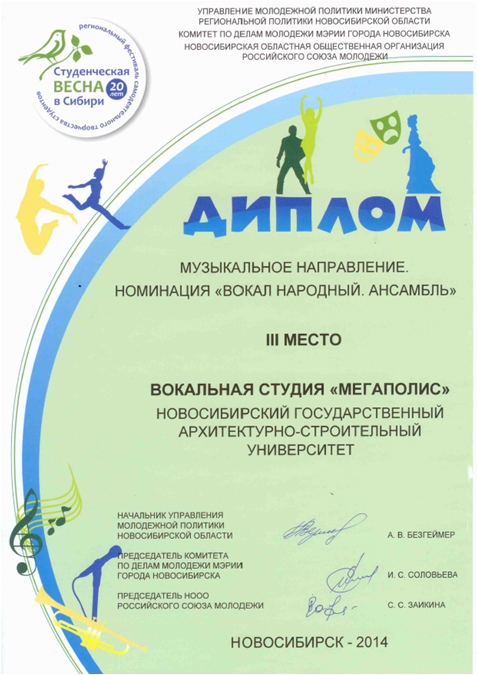 С 17 марта по 25 апреля 2014 года на концертных площадках Новосибирска и крупных областных центров прошел XX региональный фестиваль самодеятельного творчества студентов «Студенческая весна в Сибири».